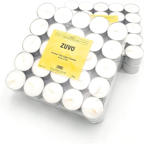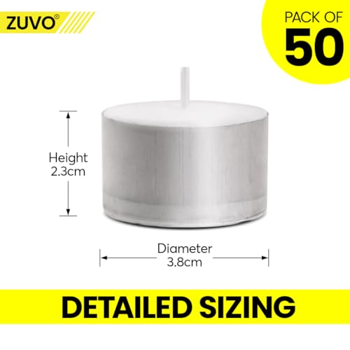 Specification: Zuvo 8-Hour Unscented Tea Light Candles (50-Pack) – Long-Lasting with Cotton Wicks, Clean Burning, 3.8 x 2.3 cm, White